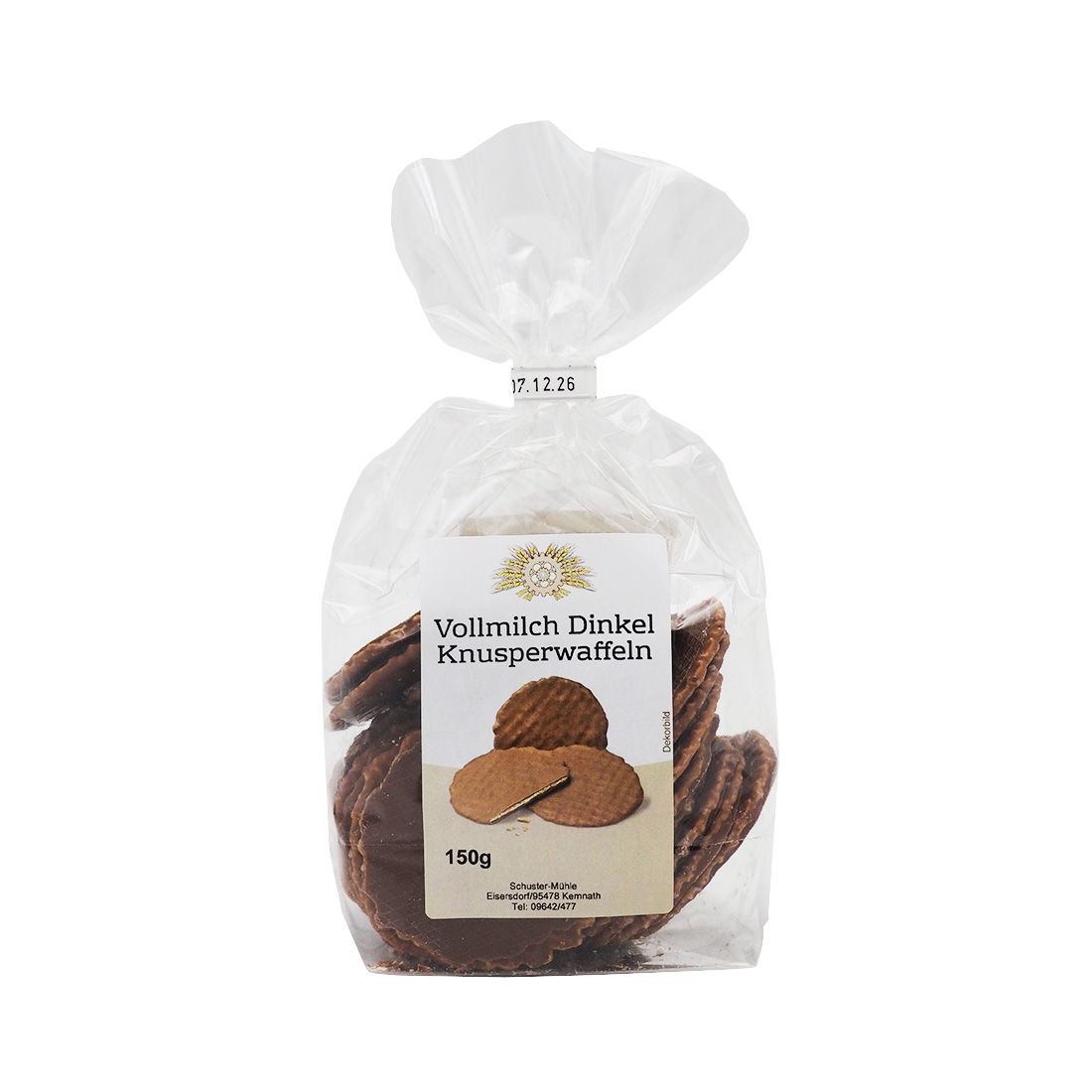 Dinkel Knusperwaffeln mit Vollmilch Schokolade überzogen. Herrlich süß und knusprig. Da kann man einfach nicht widerstehen.