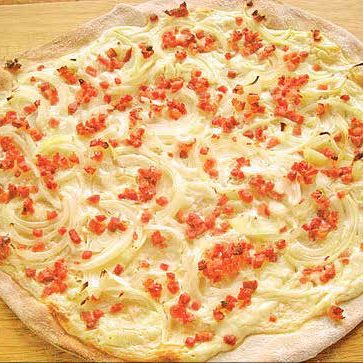Zutaten: 200 g Mehl 2 EL Öl 125 ml Wasser Salz 200 g Crème double 200 g Zwiebel(n) 100 g Speck etwas Süße Sahne Zubereitung:…
